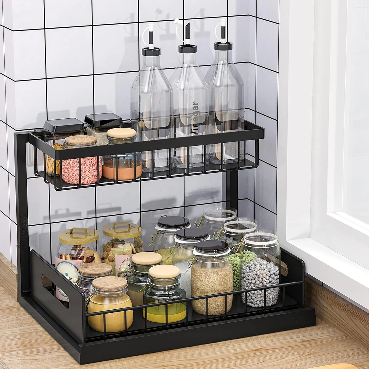 Maximize your kitchen or bathroom storage with this 2-pack pull-out under-sink organizer set. Easy to slide and install, these durable shelves keep cleaning supplies, toiletries, and essentials neatly organized and easily accessible.